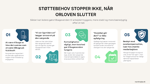- Har vi en klar ramme for, hvordan vi støtter medarbejdere, der vender tilbage efter et dødsfald